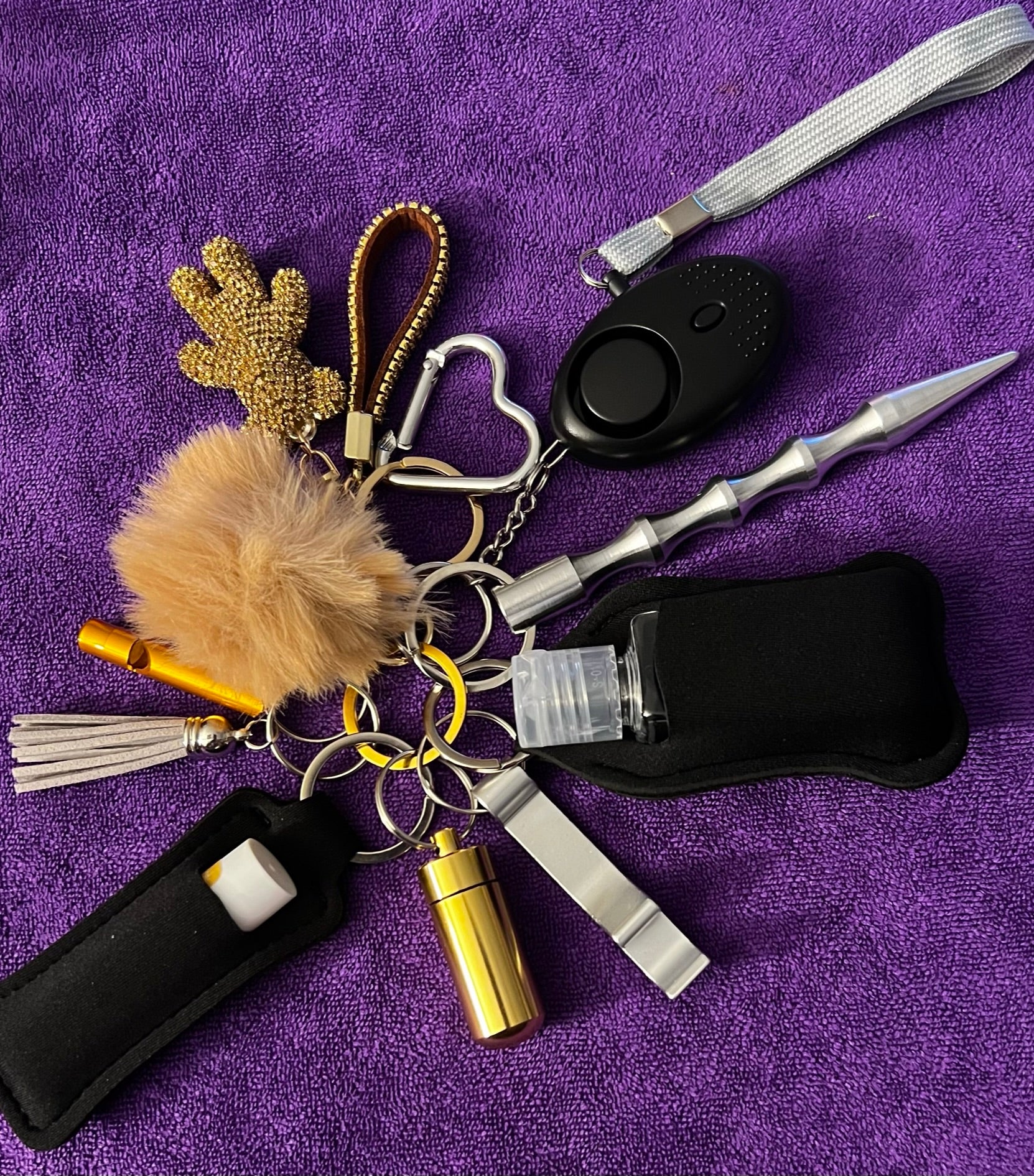 Bear charm, Pompom, Emergency whistle, Tassel, Chapstick holder, Pill holder, Bottle opener, Hand sanitizer holder, Kubaton, Safety alarm and Key hook.